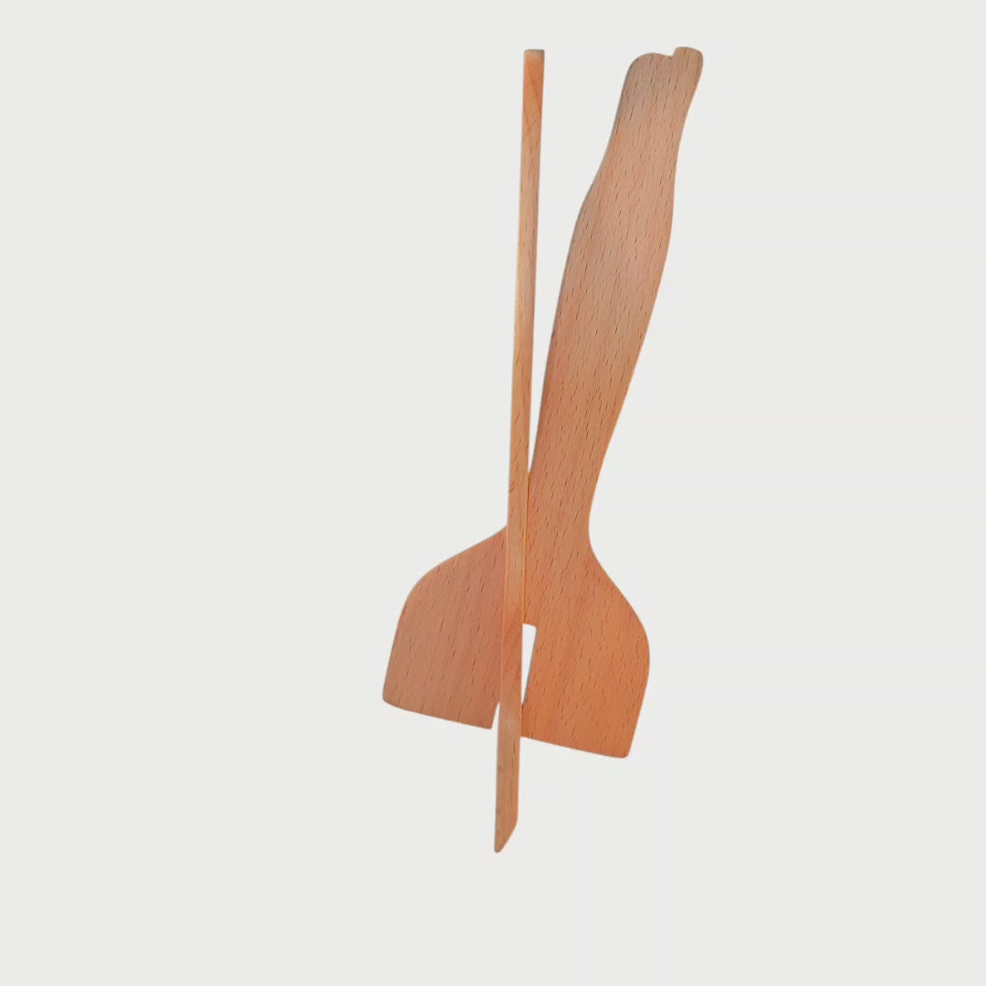 Håndlaget i flott bøk. Samme smarte designet som du kjenner: her i to deler som jobber sammen når du hakker kjøttdeig, moser avokado eller knuserpoteter — og hver for seg som brede stekespader eller serveringsbestikk. ( Perfekt til pinnekjøtt og salater)